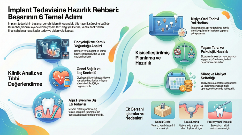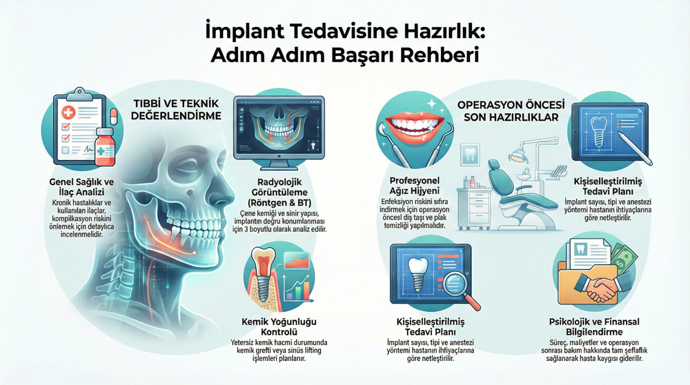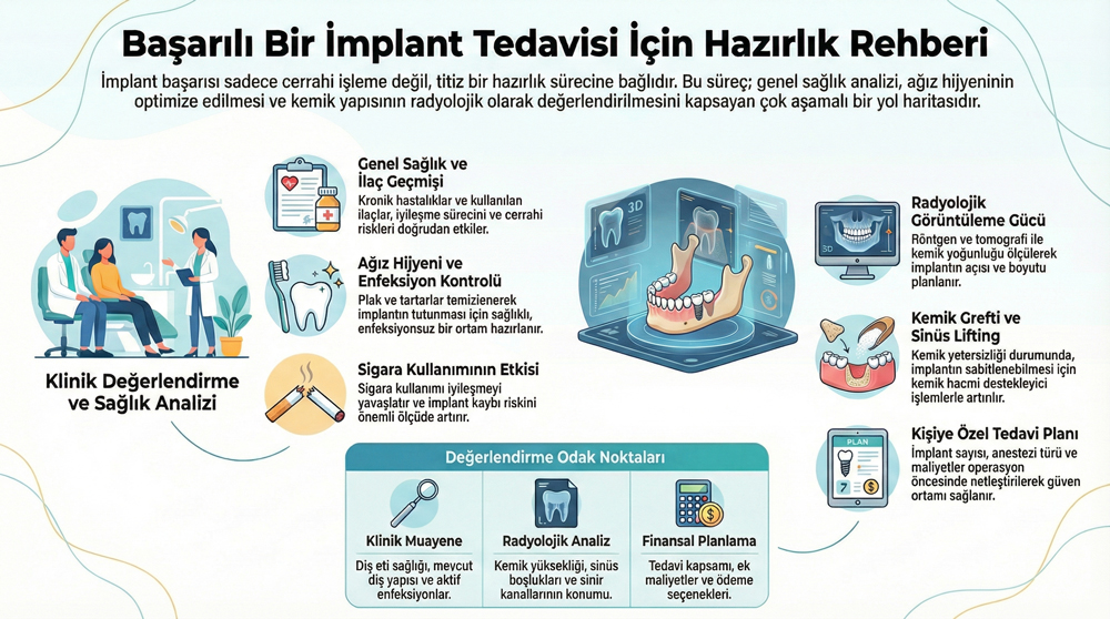 İmplant tedavisine hazırlık konulu bu rehberimizde, tedavi öncesinde nelere dikkat etmek gerektiğini kısaca ele alıyoruz. Bu rehberimizde, implant tedavisine hazırlık aşamasında en çok merak edilen konuları ana hatlarıyla paylaşıyoruz. İmplant tedavisi öncesinde bu konulara dikkat ederseniz tedavi sürecini çok daha sağlıklı şekilde geçirebilirsiniz.